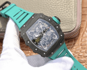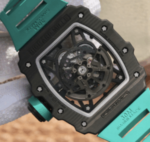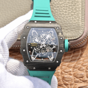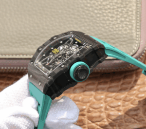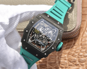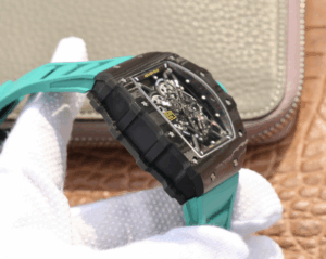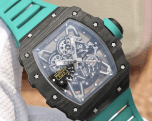 The Richard Mille RM055 KV V2 Carbon Case Blue Skeleton Dial Replica is a high quality watch. It features a stainless steel case with a forged carbon color, a sapphire crystal, and a rubber bracelet with adjustable links. The movement is an automatic RMAL1 caliber with a power reserve of 60 hours and a precision of (-3/+3 sec/day) within COSC certification limits. The dial is transparent with a skeleton index and stainless steel stick hour markers and hands.